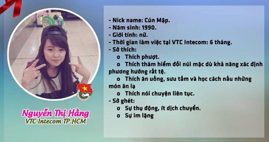 Hằng là cô em út của VP TP HCM, một trong những gương mặt trẻ của BCH Đoàn Thanh niên VTC Intecom nhiệm kỳ III (2014 - 2017) và là đại diện duy nhất của VP TP HCM trong đội ngũ của BCH Đoàn. Khi được "ngỏ lời" một bài chân dung, Hằng “cún” đã “mớm cung”: “Có thể viết về em bằng một từ duy nhất thôi: pờ phệch hoặc nếu không phải in ra word để đóng thành sách”...